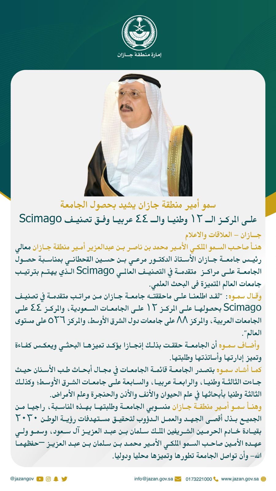 هنأ صاحب السمو الملكي الأمير محمد بن ناصر بن عبدالعزير أمير منطقة جازان معالي رئيس جامعة جازان الأستاذ الدكتور مرعي بن حسين القحطاني بمناسبة حصول الجامعة على مراكز متقدمة في التصنيف العالمي Scimago الذي يهتم بترتيب جامعات العالم المتميزة فى البحث العلمي.