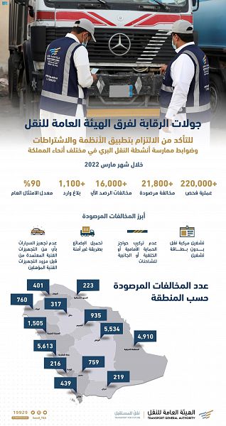 وكانت منطقة مكة المكرمة أعلى المناطق في تسجيل المخالفات, حيث بلغت (5,613) مخالفة، تلتها منطقة الرياض بـ (5,534) مخالفة، ومن ثم المنطقة الشرقية لتسجل (4,910) مخالفات، فيما سجلت منطقة المدينة المنورة (1,505) مخالفات، وسجلت نسبة الالتزام والامتثال العام للأنظمة في أنشطة وخدمات النقل البري خلال الشهر الماضي مارس 2022م (90%).