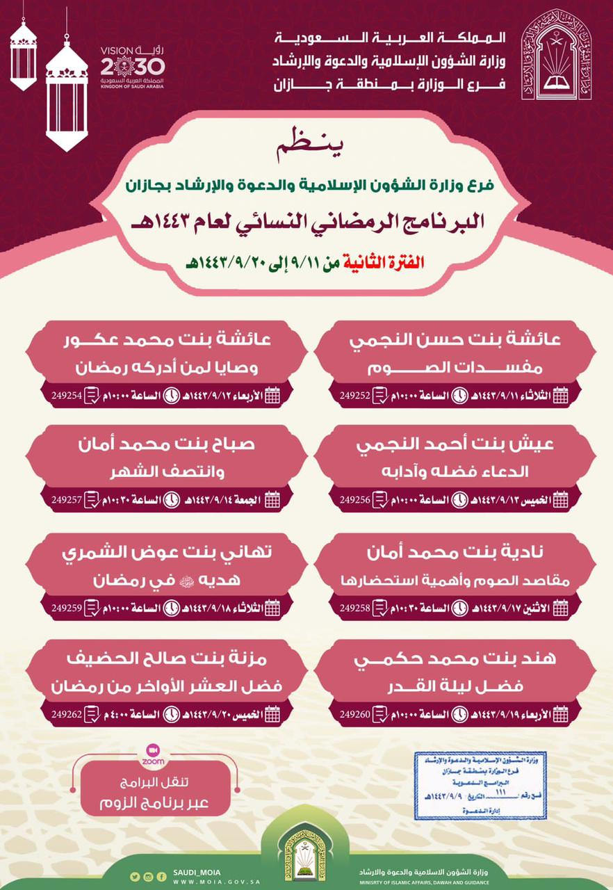 يواصل فرع وزارة الشؤون الإسلامية والدعوة والإرشاد في منطقة جازان ممثلاً بإدارة الشؤون النسائية تنفيذ البرنامج الرمضاني النسائي لعام ١٤٤٣هـ للفترة الثانية من ١٤٤٣/٩/١١هـ إلى ١٤٤٣/٩/٢٠هـ تقدم جميع المحاضرات عبر برنامج الزوم طيلة شهر رمضان المبارك.