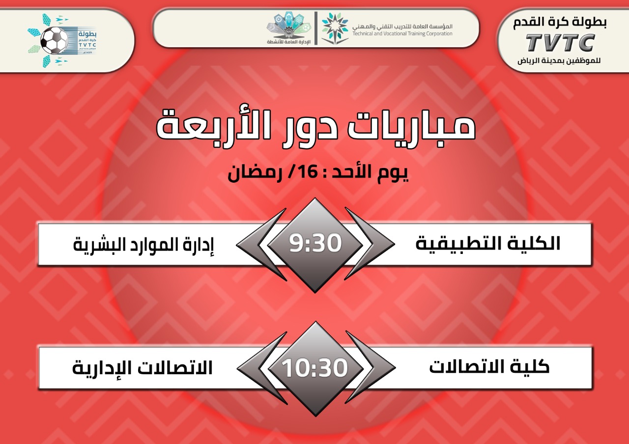 تواصل بطولة كأس المؤسسة العامة للتدريب التقني والمهني لكرة القدم للموظفين ، التي تنظمها الإدارة العامة للأنشطة بالتعاون مع إدارة النادي الرياضي بالمؤسسة.