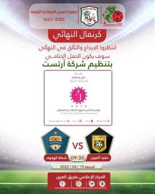 ضرب فريق العميد من العيون موعداً مثيراً مع فريق الشعلة من الهفوف وذلك في النهائي الكبير و المرتقب لبطولة العرين الرمضانية الرابعة لعام 1443 هـ حيث تمكن العميد من الوصل للنهائي عبر بوابة برذرتيم و بركلات الترجيح التي تألق فيها الحارس أحمد العساف بالتصدي لركلتين فيما كسب الشعلة بطاقة النهائي الثانية على حساب خليج الطرف في مباراة شهدت ندية و تنافس كبير الا أن الشباك لم تهتز سوى في دقائقها الأخيرة عندما انفجر الشعلة بهدفين لنجم اللقاء أحمد بوهلال و زميله حيدر البوحسن .