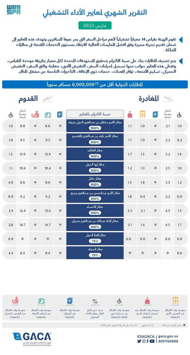 أصدرت الهيئة العامة للطيران المدني اليوم تقريرها الشهري عن أداء مطارات المملكة الدولية والمحلية، وذلك لشهر مارس 2022م، وفقاً لأربعة عشر معياراً أساسياً لقياس الأداء، وتأتي تطبيقاً للتوجُّهات الإستراتيجية التي تستهدف تجويد الخدمات المُقدَّمة للمسافرين، ورفع مستواها، وتحسين تجربة المسافر في مطارات المملكة.