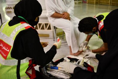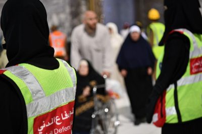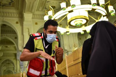 يشارك المتطوعون، الدفاع المدني في خدمة ضيوف الرحمن في تقديم خدمات الإسعافات الأولية وإرشاد المعتمرين والزوار في المسجد الحرام والمسجد النبوي في شهر رمضان المبارك من خلال عدة نقاط تغطي أرجاء الحرمين الشريفين كافة .