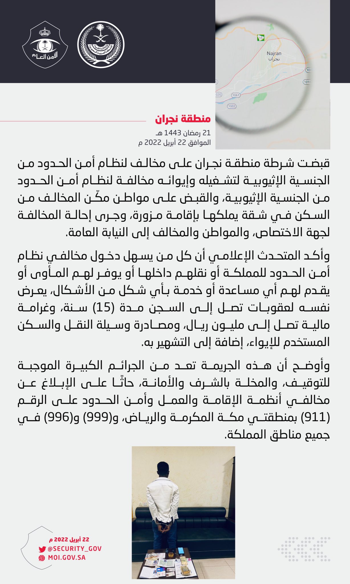 وأوضح أن هذه الجريمة تعد من الجرائم الكبيرة الموجبة للتوقيف، والمخلة بالشرف والأمانة، حاثًا على الإبلاغ عن مخالفي أنظمة الإقامة والعمل وأمن الحدود على الرقم (911) بمنطقتي مكة المكرمة والرياض، و(999) و(996) في جميع مناطق المملكة.