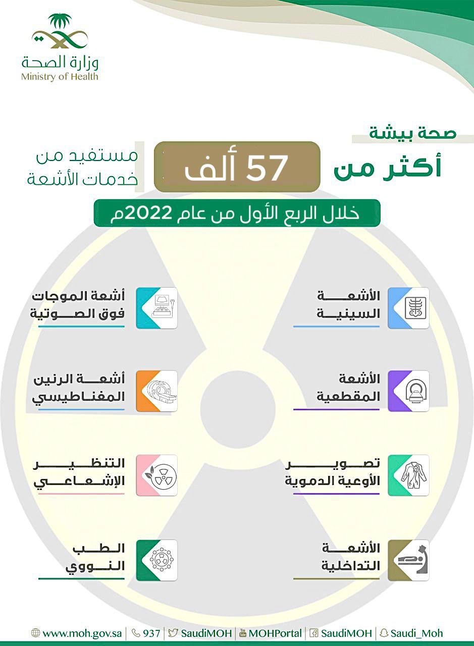 قدّمت صحة بيشة ممثلة بإدارة الأشعة خدماتها لـ 57071 مستفيداً، وذلك خلال الربع الأول من عام 2022م .