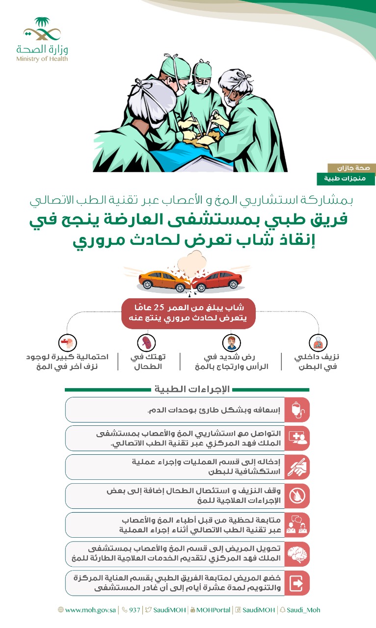 قالت الصحة في جازان بأن فريق طبي بمستشفى العارضة بجازان تمكن ولله الحمد من إنقاذ حياة شاب يبلغ من العمر ٢٥ سنة كان يعاني من نزيف داخلي في البطن وتهتك في الطحال مع وجود رض شديد في الرأس وارتجاج بالمخ مع احتمالية كبيرة لوجود نزف اخر في المخ نتيجة تعرضه لحادث مروري ، وذلك بإجراء عملية جراحية استكشاف بطن شارك فيها بالمشورة اثناء عمل اطباء الجراحة العامة استشاريي مختصين في تخصص المخ والأعصاب من مستشفى الملك فهد المركزي عبر تقنية الطب الاتصالي لتقديم النصيحة في كيف يتعامل الطاقم الطبي المنوط به اجراء جراحة البطن مع حالة المريض و وجود ارتجاج شديد بالمخ و اشتباه نزف اخر داخل المخ و تكللت العملية بالنجاح ولله الحمد .