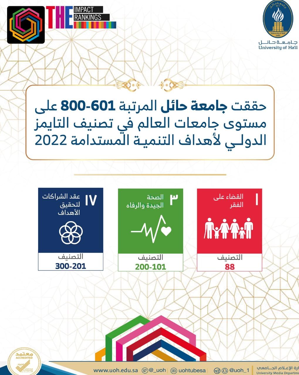 حققت جامعة حائل الترتيب (601-800) عالمياً في تصنيف التايمز الدولي ، وذلك في إطار تأثير الجامعات العالمية 2022، الذي يقيس أداء الجامعات بناء على أهداف الأمم المتحدة للتنمية المستدامة (SDG) والبالغ عددها 17 هدفًا.