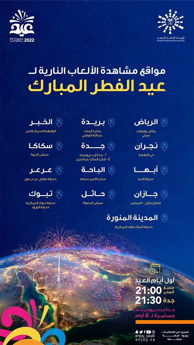 تعانق سماء المملكة في مساء أول أيام عيد الفطر مجموعة من الألعاب النارية التي تشكل إحدى فعاليات الهيئة العامة للترفيه في برنامجها لعيد هذا العام 2022، حيث تضيء الألعاب بوهجها وألوانها جميع مناطق المملكة، لتضاعف مستويات الفرح، وتهيئ لانطلاق بقية الفعاليات المتنوعة التي تصاحب سكان المملكة خلال أيام عيد الفطر.
