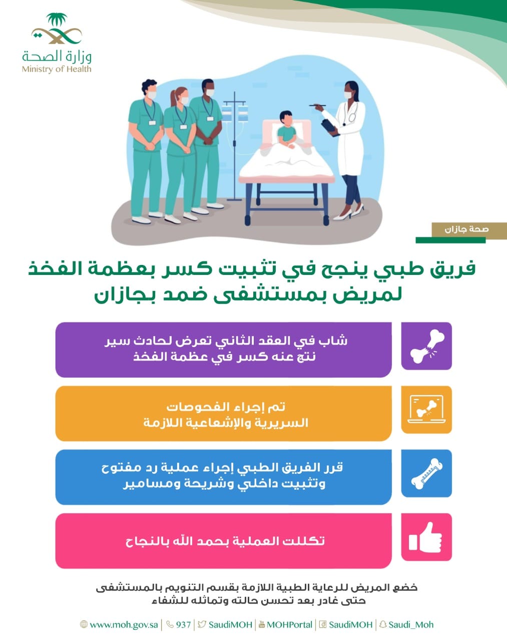 قالت صحة جازان بأن فريق طبي بمستشفى ضمد العام تمكن من تثبيت كسر بعظمة الفخذ لشاب في العقد الثاني من العمر، وتكللت العملية بالنجاح ولله الحمد.