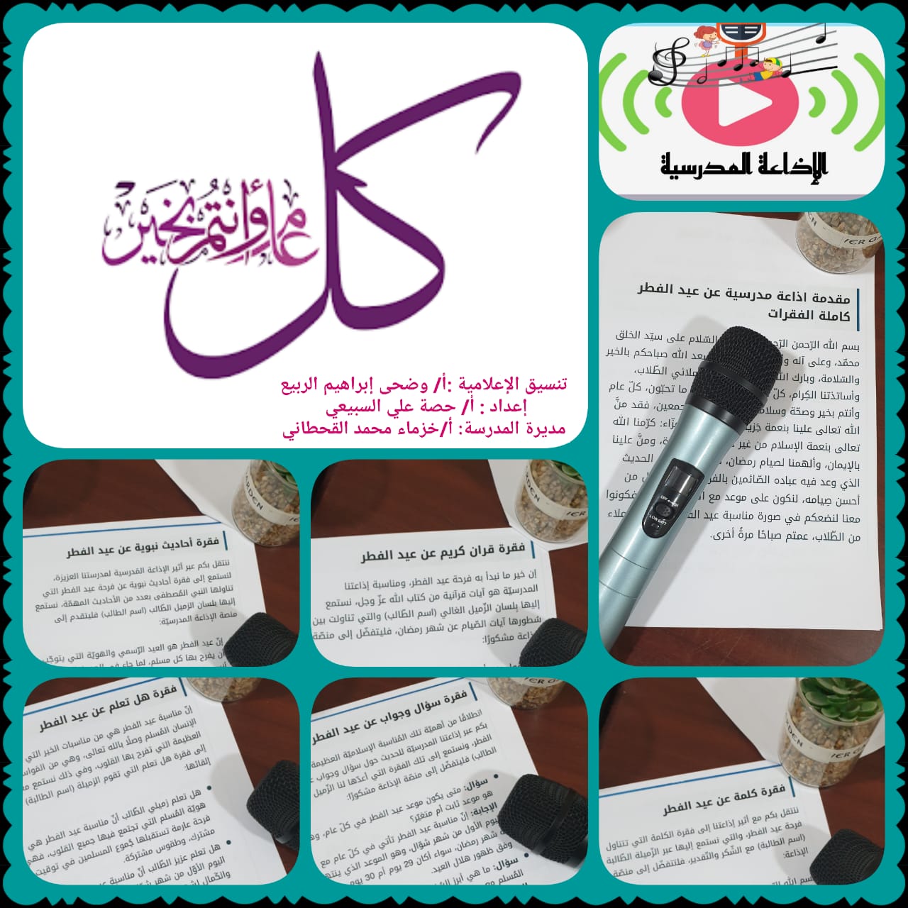 وتضمن الحفل فقرات إذاعية عن فضل العيد وأهميته لدى المسلمين ودوره في بث روح المحبة والألفة بين الجميع وخلق روح التعاون والإخاء والتعاطف والتراحم بين المسلمين، بجانب أنشودة عن العيد ومن ثم تم الإعلان بالإذاعة المدرسية عن إقامة مسابقة خلال هذا الأسبوع في أفضل بطاقة تهنئة بعيد الفطر السعيد، واصطف جميع معلمات المدرسه في المكان المخصص للمعايدة تتقدمهم مدير ةالمدرسة الأستاذة القديرة – خزماء القحطاني للسلام على جميع طالبات المدرسة وتقديم الحلويات لهم وسط تبادل التهاني والتبريكات بين الجميع في جو يسوده الود المحبة والوئام ابتهاجاً بهذه المناسبة المباركة وتعويدًا للطالبات على تبادل التهنئة الشرعية.