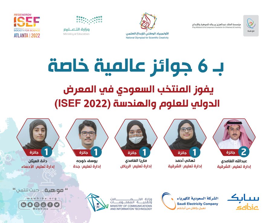 حققت المملكة العربية السعودية ممثلة في مؤسسة الملك عبدالعزيز ورجاله للموهبة والإبداع “موهبة”، ووزارة التعليم، وللعام السادس عشر على التوالي، 6 جوائز خاصة خلال مشاركتها في معرض *ريجينيرون الدولي للعلوم والهندسة “آيسف” 2022، الذي يقام في أتلانتا بولاية جورجيا الأمريكية، خلال الفترة من 7 إلى 13 مايو الجاري .