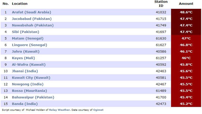 وتالياً ترتيب درجات الحرارة العظمى التي سُجلت عالمياً ليوم الاثنين 16/5/2022م: