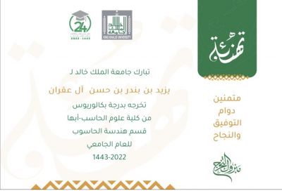تلقى العميد بندر بن حسن آل عقران التهاني والتبريكات بمناسبة تخرج ابنه يزيد من كلية علوم الحاسب بجامعة الملك خالد.