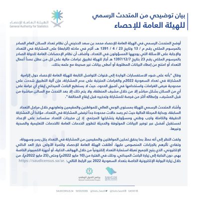 بيان صحفي توضيحي من المتحدث الرسمي للهيئة العامة للإحصاء عن إلزامية المشاركة في ⁧‫#تعداد_السعودية_2022‬⁩.