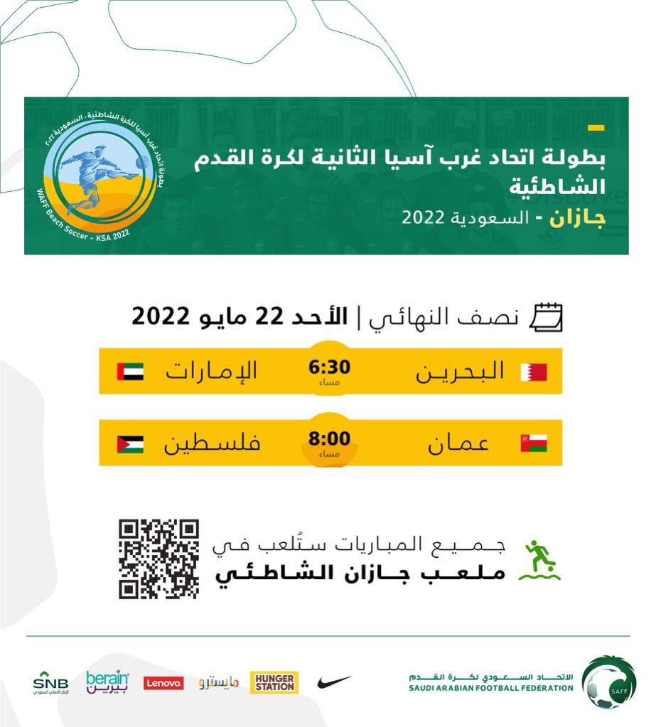 تنطلق غدًا الأحد منافسات الدور نصف النهائي من بطولة اتحاد غرب آسيا لكرة القدم الشاطئية والتي تستضيفها جازان خلال الفترة من 18-23 مايو الجاري.