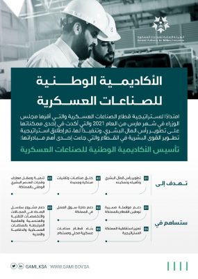 أعلنت الهيئة العامة للصناعات العسكرية عن تأسيس “الأكاديمية الوطنية للصناعات العسكرية” لتدريب وتأهيل وتمكين الكوادر الوطنية من العمل في قطاع الصناعات العسكرية والدفاعية للمساهمة في تحقيق مستهدفات التوطين، وبما يلبي متطلبات خطة سلاسل الإمداد في القطاع التي أعلنت عنها الهيئة في منتصف العام 2021، وتحقيق أحد مخرجات استراتيجية تطوير القوى البشرية في القطاع التي تم الإعلان عنها في فبراير الماضي.