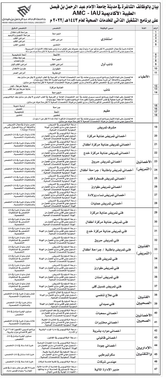 أعلنت جامعة الإمام عبدالرحمن بن فيصل، عن توفر وظائف شاغرة لديها في المدينة الطبية الأكاديمية على برنامج التشغيل الذاتي للخدمات الصحية