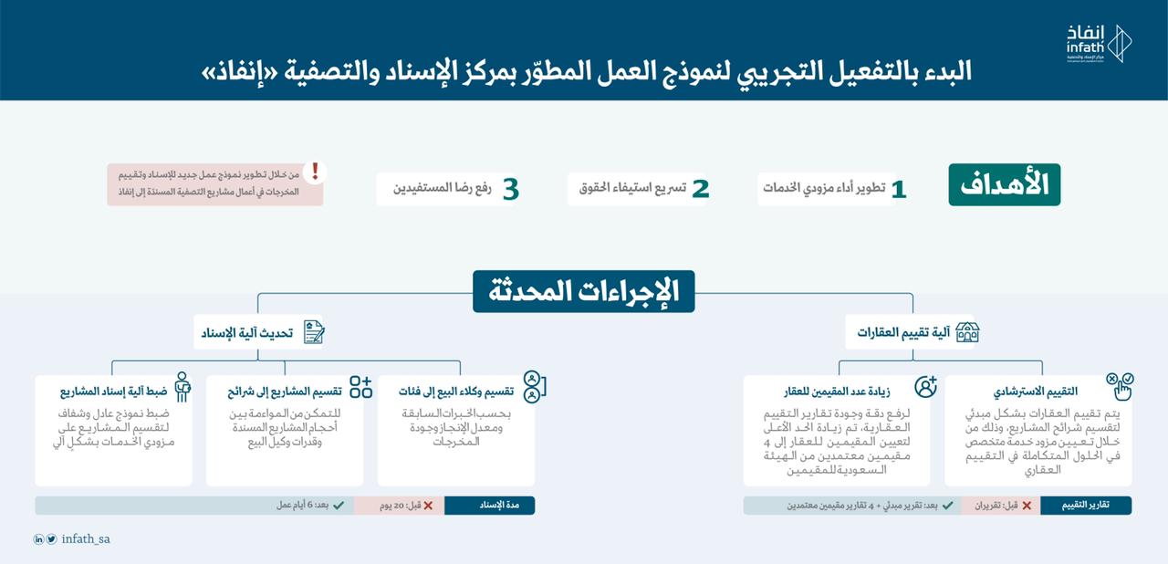 عن البدء التجريبي لتفعيل النموذج المطوّر لعمليات المركز كخطوة جديدة لتسريع إجراءات التصفية والبيع للأصول المسندة إليه، وذلك من خلال تطوير آلية إسناد الأعمال إلى مزودي الخدمة بما يحقق مستوى عالٍ من رضا المستفيدين.