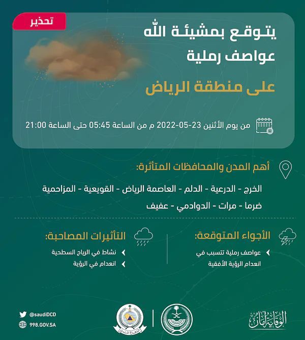 نبهت المديرية العامة للدفاع المدني، اليوم الاثنين، إلى تعرض منطقتي الرياض والشرقية إلى عواصف رملية، وفق تحذيرات المركز الوطني للأرصاد.