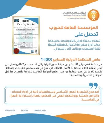 أخبار محلية > “المؤسسة العامة للحبوب” تحصل على شهادة الآيزو العالمية في إدارة استمرارية الأعمال