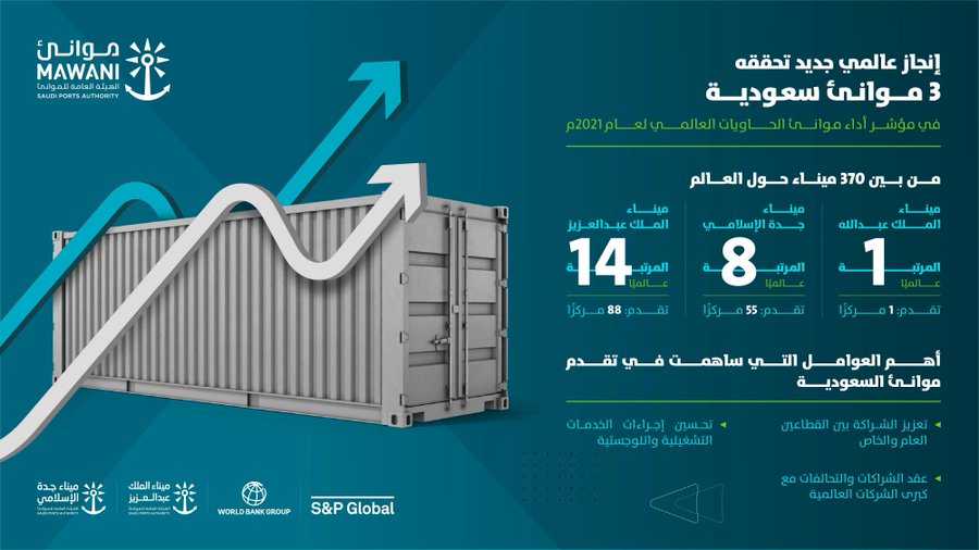 حققت موانئ المملكة الصدارة بين 370 ميناءً عالميًا بحصول ميناء الملك عبدالله على المرتبة الأولى، وميناء جدة الإسلامي على المرتبة الثامنة عالمياً، بينما أحرز ميناء الملك عبدالعزيز المرتبة الرابعة عشرة من حيث كفاءة الموانئ التشغيلية، وذلك وفق التقرير الدولي لمؤشر أداء موانئ الحاويات عالميا لعام 2021م، الذي يصدر عن البنك الدولي ومؤسسة أستاندرد آند بورز جلوبال ماركيت إنتليجانس.