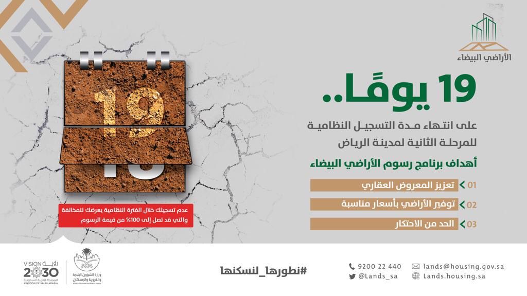 وأضاف: “جميع ملاك الأراضي البيضاء الواقعة داخل النطاقات الجغرافية للمدن التي يُطبق فيها رسوم الأراضي البيضاء مطالبين بتسجيل أراضيهم عبر البوابة الإلكترونية بما في ذلك ملاك الأراضي البيضاء المطورة في مدينة الرياض، وذلك قبل انتهاء مهلة التسجيل النظامية للمرحلة الثانية بعد 19 يوما”.