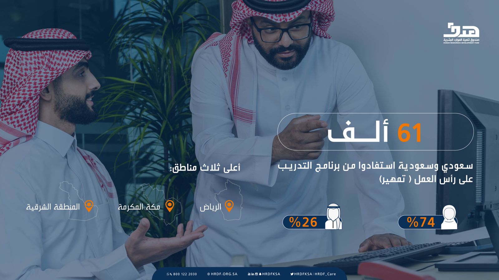 كشف صندوق تنمية الموارد البشرية (هدف)، عن استفادة أكثر من 61 ألف خريج وخريجة دبلوم وبكالوريوس فأعلى من برنامج التدريب على رأس العمل (تمهير) وذلك منذ بداية إطلاق البرنامج في 2017 وحتى الآن.