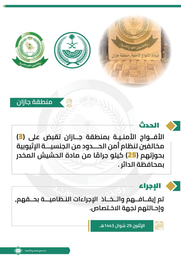 قبضت دوريات الأفواج الأمنية بمنطقة جازان على (3) مخالفين لنظام أمن الحدود من الجنسية الإثيوبية بمحافظة الدائر، بحوزتهم (25) كيلو جرامًا من مادة الحشيش المخدر، وتم إيقافهم واتخاذ الإجراءات النظامية بحقهم، وإحالتهم لجهة الاختصاص.