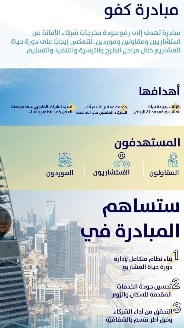 أطلقت أمانة منطقة الرياض مبادرة “كفو” الهادفة إلى تقييم أداء الاستشاريين والمقاولين والموردين العاملين في مدينة الرياض، لضمان تحسين جودة أداء تنفيذ المشاريع الخدمية في العاصمة.