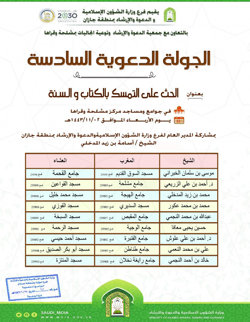 يقيم فرع وزارة الشؤون الإسلامية والدعوة والإرشاد في منطقة جازان الجولة الدعوية السادسة في ( الحث على التمسك بالكتاب والسنة ) والتي تنطلق بعد مغرب هذا اليوم الأربعاء الثاني من شهر ذي القعدة 1443 هجرية بمشاركة فضيلة المدير العام للفرع الشيخ أسامة بن زيد مدخلي ويتحدث فيها فضيلة مساعد المدير العام الشيخ موسى بن سلمان خبراني وفضيلة الشيخ الدكتور أحمد بن علي الزريعي وفضيلة الشيخ محمد بن زيد مدخلي وعدد من دعاة الفرع الرسميين والمتعاونين حيث ستقام هذه الجولة في مساجد وجوامع مركز مشلحة التابع لمحافظة صبيا .