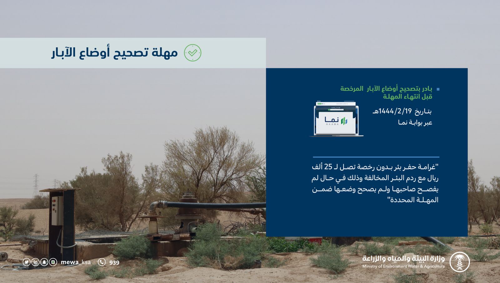 وأبان أن العقوبة المنصوص عليها في “لائحة المخالفات والعقوبات” أن حفر بئر بدون رخصة تصل إلى (25 ألف ريال مع ردم البئر المخالفة)، في حال لم يفصح صاحبها ولم يصحح وضعها ضمن المهلة المحددة.