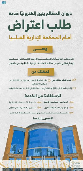 أطلق ديوان المظالم عبر منصة معين الرقمية خدمة تقديم طلب اعتراض أمام المحكمة الإدارية العليا التي تتيح لأطراف الدعاوى وممثليهم الاعتراض على الأحكام والقرارات القضائية الصادرة من محاكم الاستئناف الإدارية وبشكل رقمي كامل ودون الحاجة إلى مراجعة المحكمة.