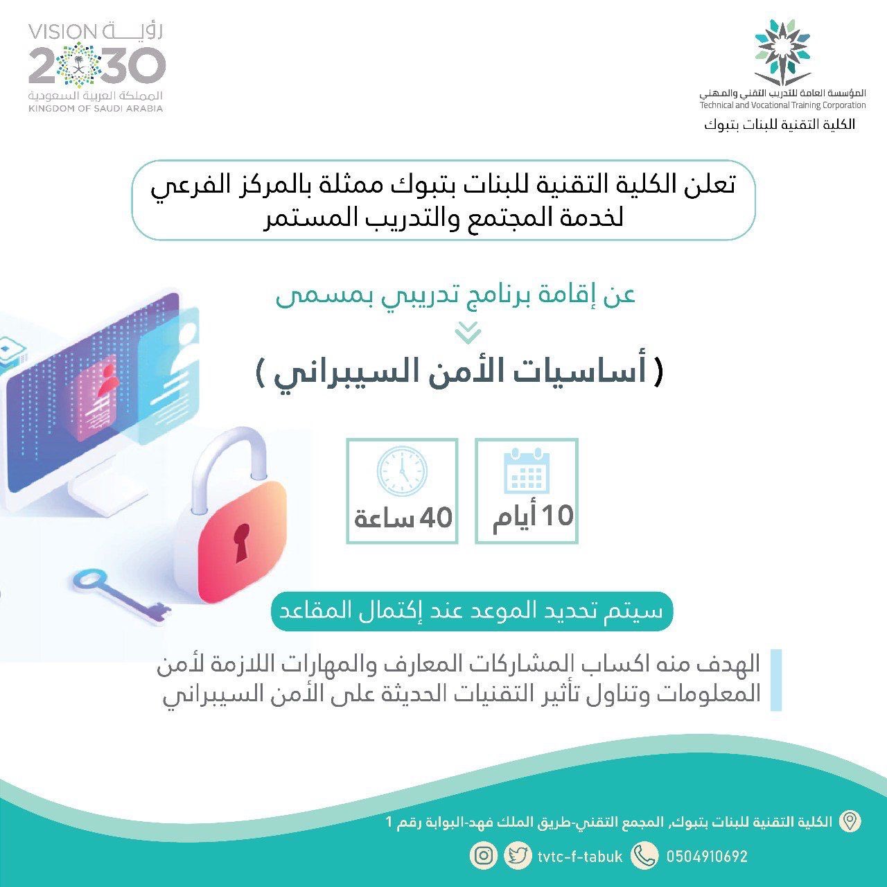 أعلنت الكلية التقنية للبنات بمنطقة تبوك ممثلة بالمركز الفرعي لخدمة المجتمع عزمها عن إطلاق برنامج “أساسيات الأمن السيبراني” في الخامس من يونيو 2022 م.