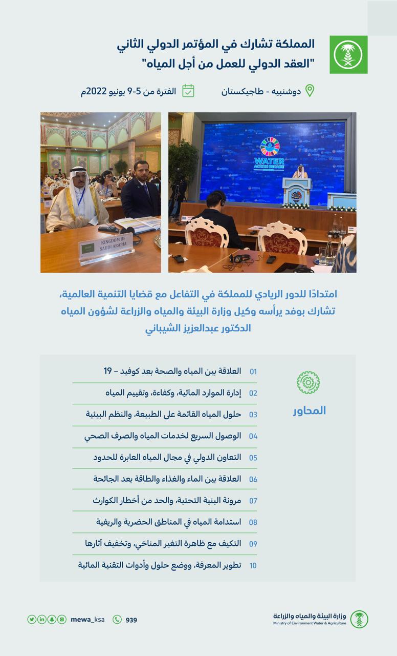 شاركت المملكة في المؤتمر الدولي الثاني رفيع المستوى لتنفيذ العقد الدولي للعمل تحت عنوان (المياه من أجل التنمية المستدامة 2018 – 2028)، الذي يعقد حاليًا في مدينة دوشنبيه في جمهورية طاجيكستان خلال الفترة من 6 حتى 9 يونيو 2022م.