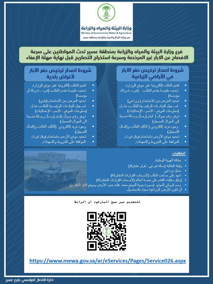 فيما يجب توفر الشروط وهي بطاقة الهوية الوطنية, وثيقة الملكية (صك شرعي ، قرار مشترك), سجل زراعي, تعهد على صاحب الطلب (لأصحاب القرارات المشتركة), إرفاق ما يثبت التقدم على منصة أحكام (لأصحاب القرارات المشتركة), رسم كروكي للموقع (صورة جوية للموقع محدد عليه حدود الأرض وموقع البئر المقترح), أن تكون الأرض الزراعية محياه بالمحاصيل .