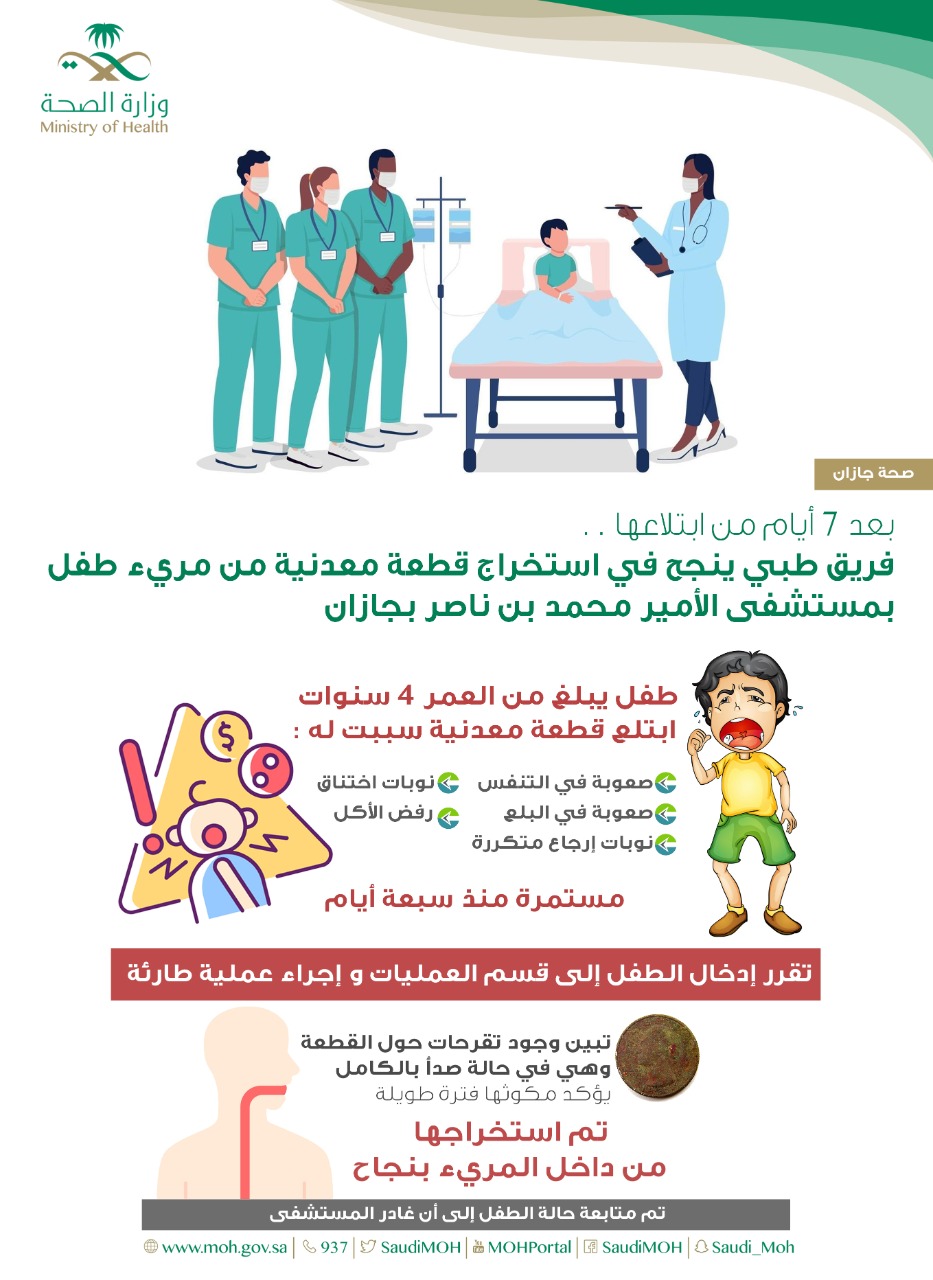 وبينت في التفاصيل بأن طفلاً يبلغ من العمر 4 سنوات حضر إلى قسم الطوارئ وهو يعاني من صعوبة في التنفس مع نوبات اختناق ، إضافةً إلى صعوبة في البلع ورفض الأكل ونوبات إرجاع متكررة مستمرة منذ سبعة أيام ، وبعد إجراء الفحوصات الطبية والاشعاعية للطفل ، تبين وجود جسم معدني شبيه بالعملة المعدنية مستقرة داخل المريء ، مما تقرر إدخال الطفل إلى قسم العمليات ، وإجراء عملية طارئة ، إذ تبين أثناء إجراء منظار صلب للمريء وجود تقرحات حول القطعة المعدنية وفي حالة صدأ بالكامل مما يؤكد وجودها منذ فترة طويلة ، إذ تم إستخراج القطعة المعدنية من داخل مريء الطفل بكل نجاح .