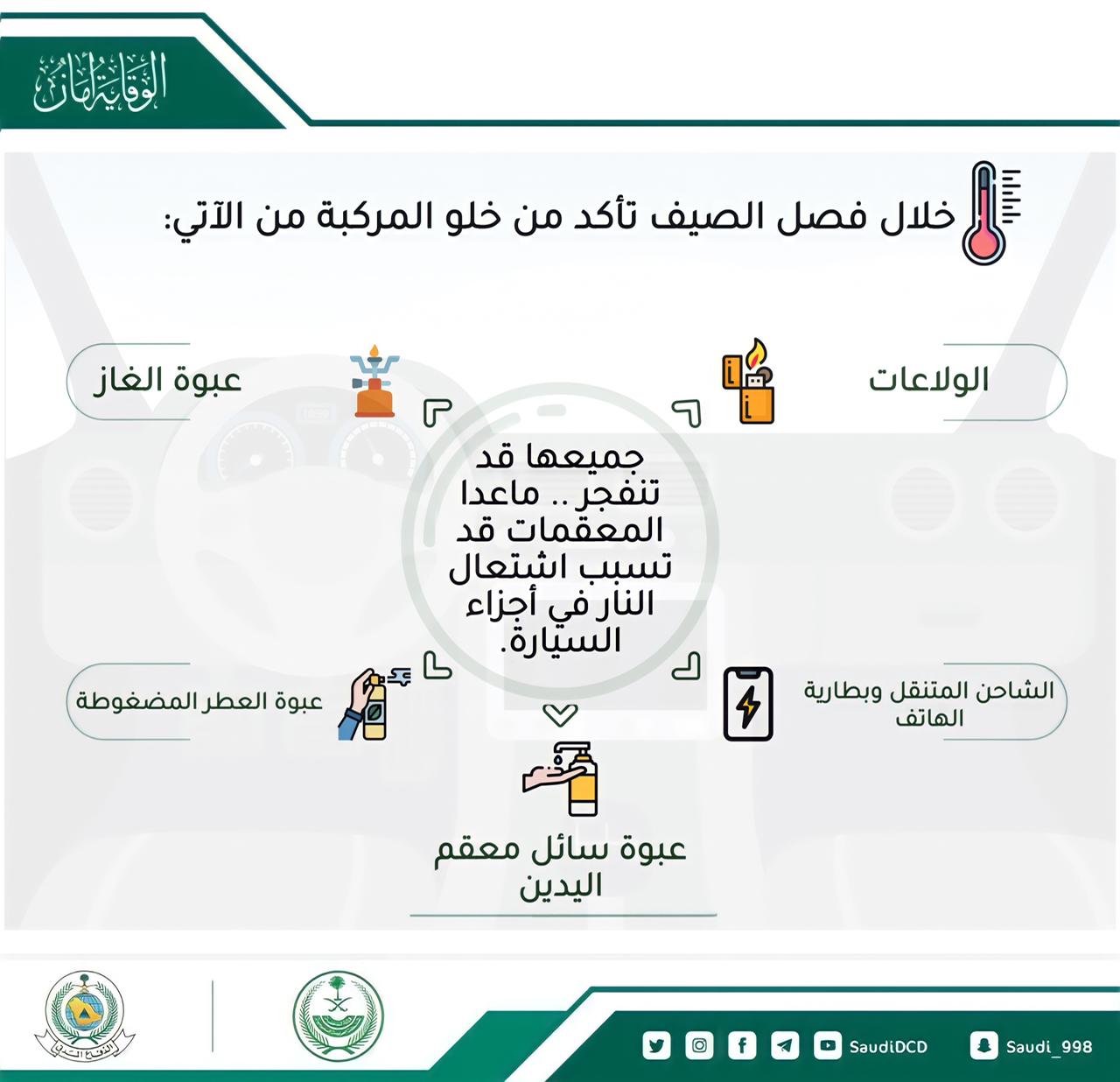 أكدت المديريه العامه للدفاع المدني علي انه في ظل الأجواء الحارة عند ارتفاع درجات الحرارة في فصل الصيف على خلو المركبة من (عبوات الغاز – السجائر الالكترونية – ولاعة السجائر – بطاريات الهواتف و منافذ الشواحن – عبوات العطر المضغوطة – عبوات سائل ومعقم اليدين – الأجهزة الإلكترونية – العبوات البلاستيكية – مستحضرات التجميل ) مع الأخذ بالاعتبار أن جميع هذه المنتجات، قد تنفجر ما عدا المعقمات والمستحضرات التجميلية والعبوات البلاستيكية والتي قد تتسبب في إشعال النار في أجزاء من السيارة .