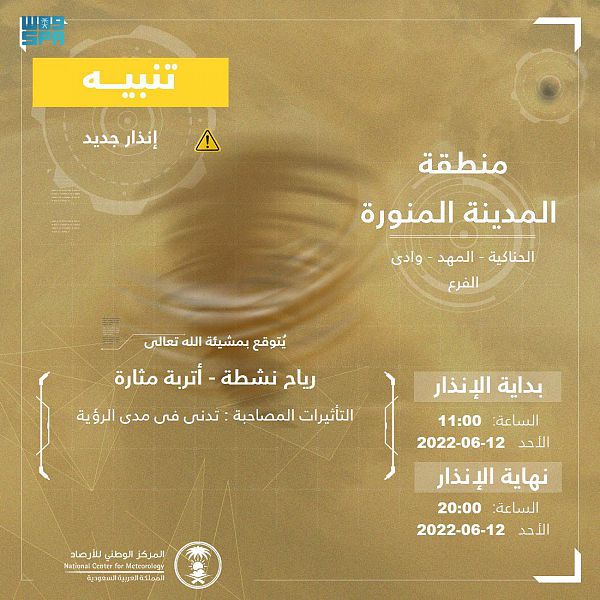 أصدر المركز الوطني للأرصاد تنبيهاً بشأن حالة الطقس اليوم بمنطقة المدينة المنورة – بمشيئة الله – تضمنت رياحا نشطة وأتربة مثارة , تشمل تأثيراتها تدنياً في مدى الرؤية ، على محافظات الحناكية والمهد ووادي الفرع.