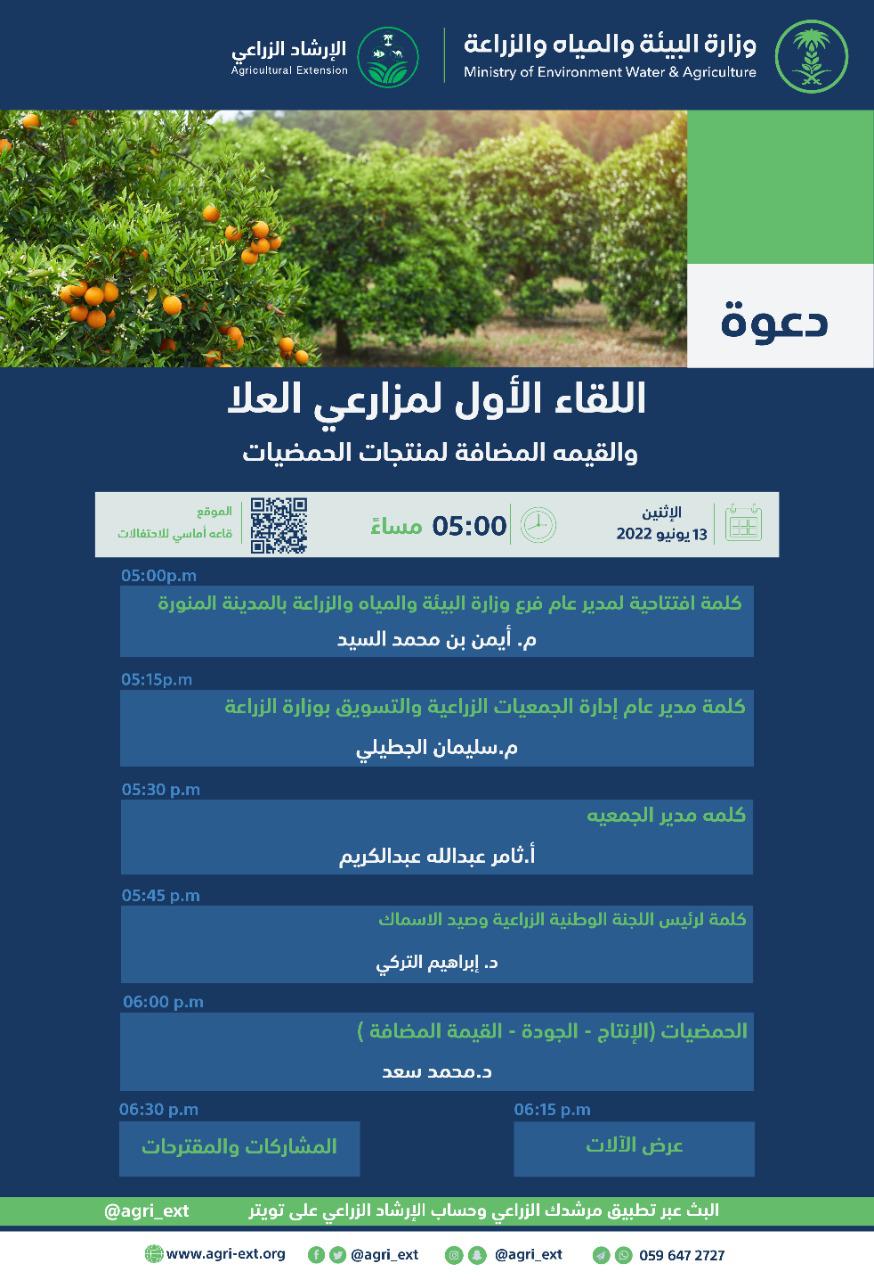 ينظم فرع وزارة البيئة والمياة والزراعة في محافظة العلا بمنطقة المدينة المنورة، غداً الإثنين اللقاء الأول لمزارعي العلا تحت عنوان: القيمة المضافة لمنتجات الحمضيات.