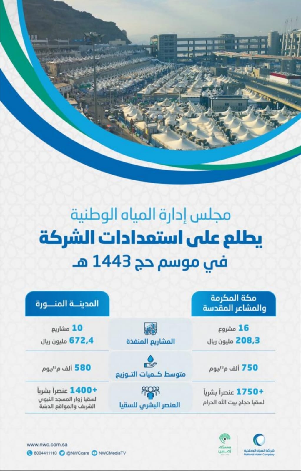 “المياه الوطنية” تدعم كفاءتها التشغيلية في موسم حج 1443 بـ (26) مشروعاً تجاوزت تكلفتها (880) مليون ريال