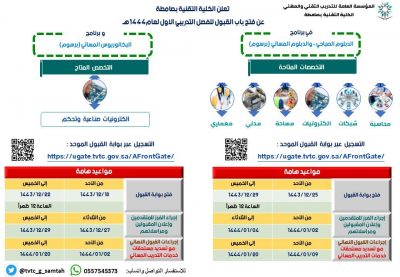 وأوضح عميد الكلية محمد بن حسين طليس، أن التسجيل سيكون متاحاً عبر “بوابة قبولي” في موقع المؤسسة العامة للتدريب التقني والمهني: https://ugate.tvtc.gov.sa/AFrontGate/، في عددٍ من التخصصات الفنية، تشمل مرحلة الدبلوم الصباحي والمسائي في قسم التقنية الإلكترونية تخصص “إلكترونيات صناعية وتحكم”، وقسم التقنية الإدارية “تخصص محاسبة”، وقسم الحاسب الآلي وتقنية المعلومات تخصص “إدارة أنظمة شبكات”، وقسم التقنية المدنية والمعمارية والمساحة “تخصص مدني”، و”تخصص معماري” و”تخصص مساحة”. ولمرحلة البكالوريوس المسائي بقسم التقنية الإلكترونية تخصص “إلكترونيات صناعية وتحكم”.