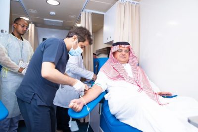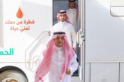 دشن سمو الأمير منصور بن محمد بن سعد آل سعود محافظ حفر الباطن اليوم حملة التبرع بالدم بمناسبة اليوم العالمي للتبرع بالدم تحت شعار “بادرة تضامن .. شارك في الجهد وانقذ الأرواح” التي تقيمها مديرية الشؤون الصحية وذلك في مقر محافظة حفر الباطن.