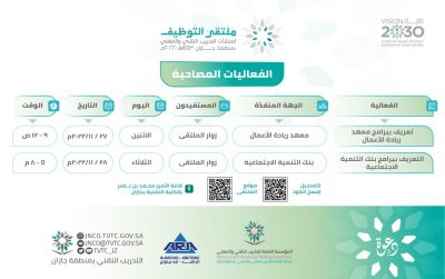 وتدعو الإدارة العامة الخريجين والخريجات لحضور الملتقى والمشاركة في فعالياته وذلك يومي الإثنين والثلاثاء الموافق 28 – 29/ 11 / 1443هـ الذي يضم أكثر من عشرون جهة مختصة بالتوظيف ولأكثر من ألف فرصة وظيفية إضافة إلى البرامج المصاحبة على مدار اليومين للتعريف ببرامج معهد ريادة الأعمال والتعريف ببرامج بنك التنمية الاجتماعية ، واستعراض الفرص الوظيفية الخاصة بالخريجين والخريجات بمختلف منشآت التدريب التقني والمهني بالمنطقة .