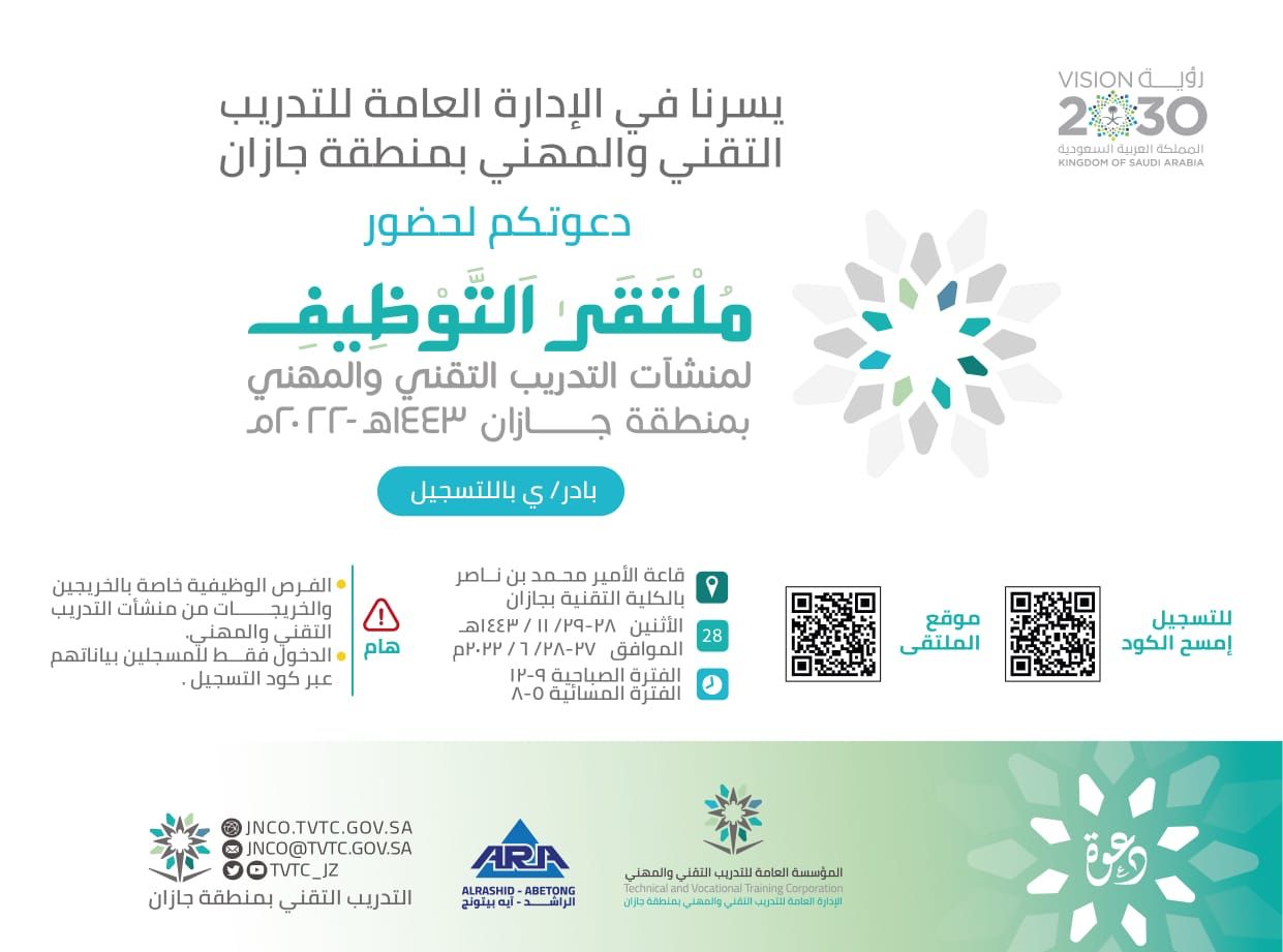 تنظم الإدارة العامة للتدريب التقني والمهني بمنطقة جازان غداً ، ملتقى التوظيف السنوي لمنشآت التدريب التقني والمهني بالمنطقة للعام 1443هـ ، وذلك بقاعة الأمير محمد بن ناصر بمقر الكلية التقنية بجازان.
