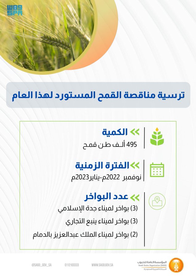 يذكر أن موسم استلام القمح المحلي من المزارعين للموسم الزراعي الحالي مستمر حتى شهر أكتوبر المقبل، وجرى استلام كمية 326 ألف طن، وذلك في إطار خطتها لتنويع مصادر شراء القمح وتعزيز المخزونات الإستراتيجية منه, كما يمكن للمهتمين استعراض أسعار الترسية لمناقصات المؤسسة من خلال موقعها الإلكتروني: http://www.sago.gov.sa/Import/Wheat.