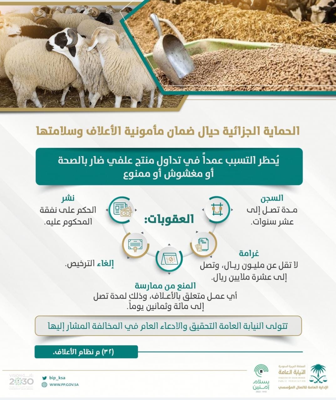 النيابة العامة: السجن لمدة تصل إلى عشر سنوات وغرامة تصل إلى عشرة مليون ريال عقوبة التسبب عمداً في تداول منتج علفي ضار بالصحة أو مغشوش أو ممنوع.