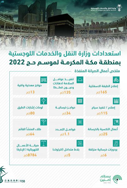 نفذت وزارة النقل والخدمات اللوجستية بمنطقة مكة المكرمة عدداً من أعمال الصيانة ومبادرات السلامة على مواقع متفرقة من الطرق المؤدية إلى مكة المكرمة خلال موسم حج هذا العام 1443هـ، للإسهام في ضمان سلامة وصول ضيوف الرحمن وسهولة تنقّلهم إلى المشاعر المقدسة وأداء شعائر الحج بكل يسر.