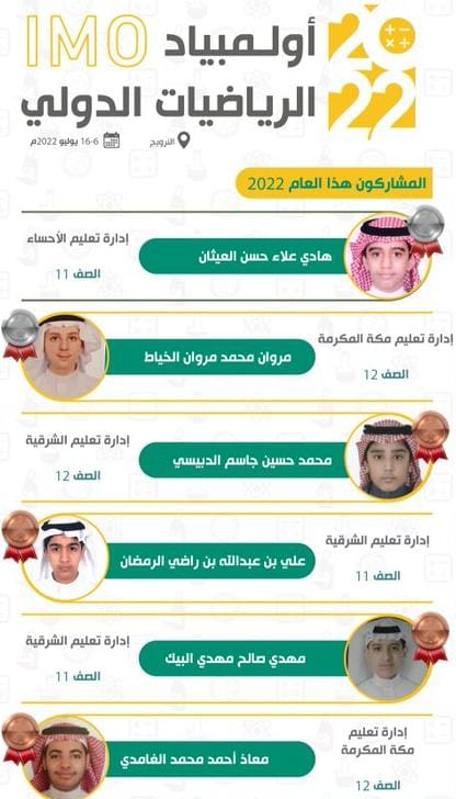 أخبار محلية > المنتخب السعودي يحصد 6 جوائز عالمية في أولمبياد الرياضيات الدولي 2022 في النرويج