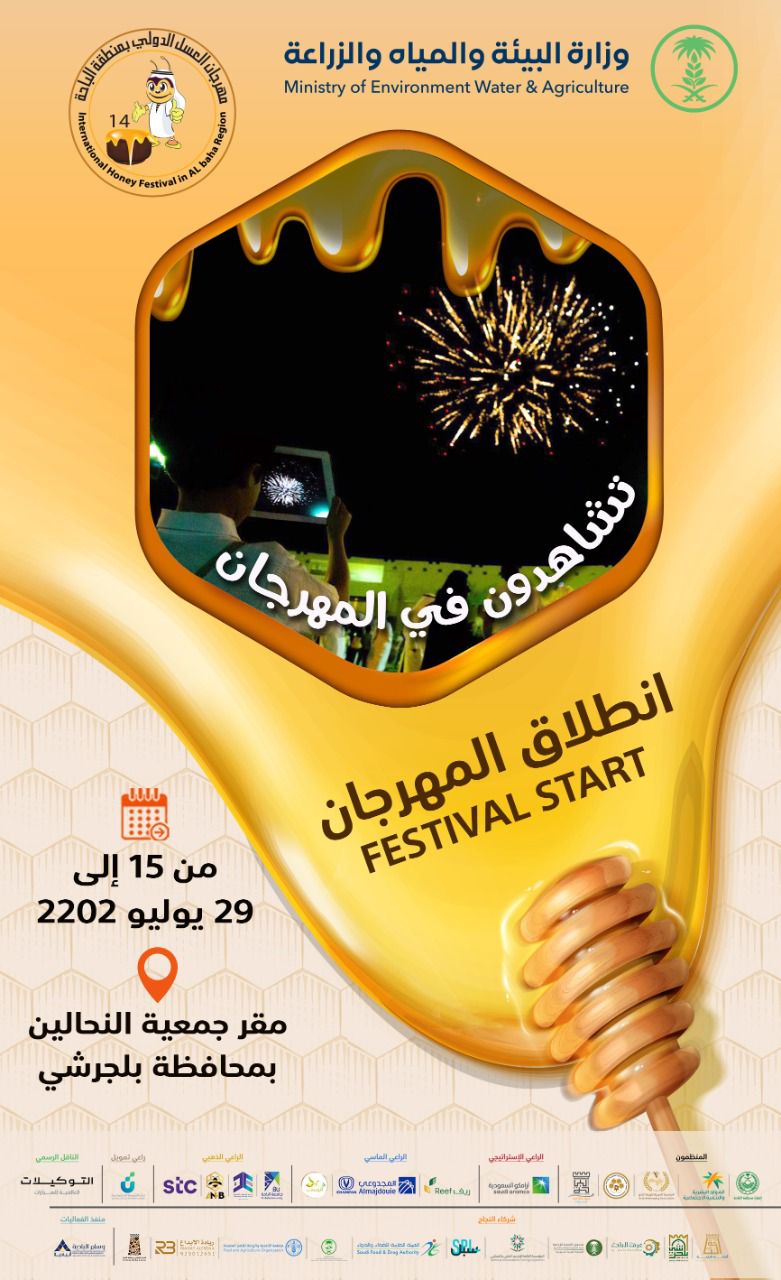 ينطلق اليوم الجمعة ١٦ ذي الحجة ١٤٤٣هـ مهرجان العسل الدولي الرابع عشر والفعاليات المصاحبة، بالتزامن مع افتتاح المؤتمر الدولي الرابع للجمعية العربية لتربية النحل ومنتدى النحالين الوطني الثاني وافتتاح مباني ومشاريع جمعية النحالين التعاونية بالباحة، وذلك برعاية كريمة من صاحب السمو الملكي الأمير الدكتور حسام بن سعود بن عبدالعزيز أمير منطقة الباحة، بمقر الجمعية ببلجرشي، بتنظيم من جمعية النحالين التعاونية وفرع وزراه البيئة والمياه والزراعة بالباحة وتنفيذ مؤسسة وسام البادية للمؤتمرات والمهرجانات.