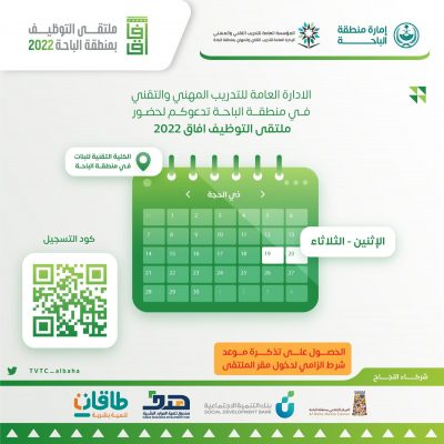 تحت رعاية صاحب السمو الملكي الأمير الدكتور حسام بن سعود أمير منطقة الباحة وحضور معالي محافظ المؤسسة العامة للتدريب التقني والمهني الدكتور احمد الفهيد، تواصل الإدارة العامة للتدريب التقني والمهني بمنطقة الباحة استعداداتها لتنظيم واستضافة ملتقى التوظيف 2022 تحت مسمى “آفاق” يومي الاثنين والثلاثاء 19- 20 ذو الحجة للعام ١٤٤٣هـ ، الموافق 18- 19 يوليو 2022م ، والذي يستهدف الخريجين والخريجات من منشآت التدريب التقني والمهني بمنطقة الباحة والتعرّف على سوق العمل وفرص العمل المُتاحة لأكثر من 20 جهة.